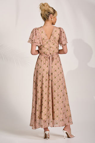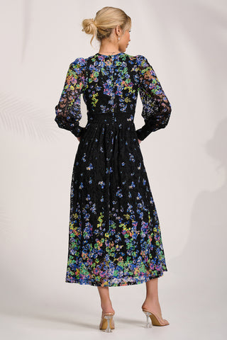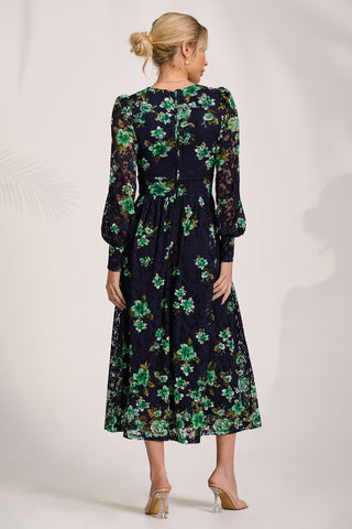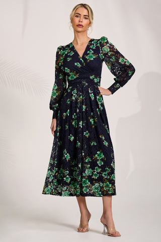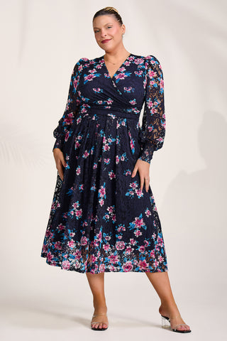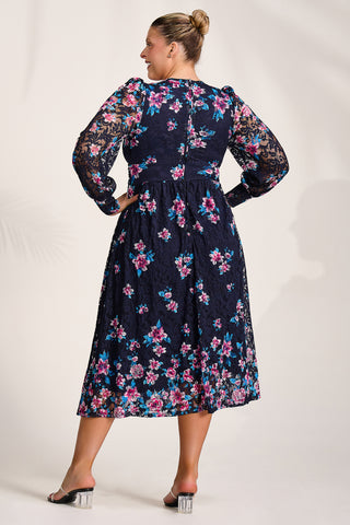 Long Sleeve Printed Lace Maxi Dress, Navy Pink Floral